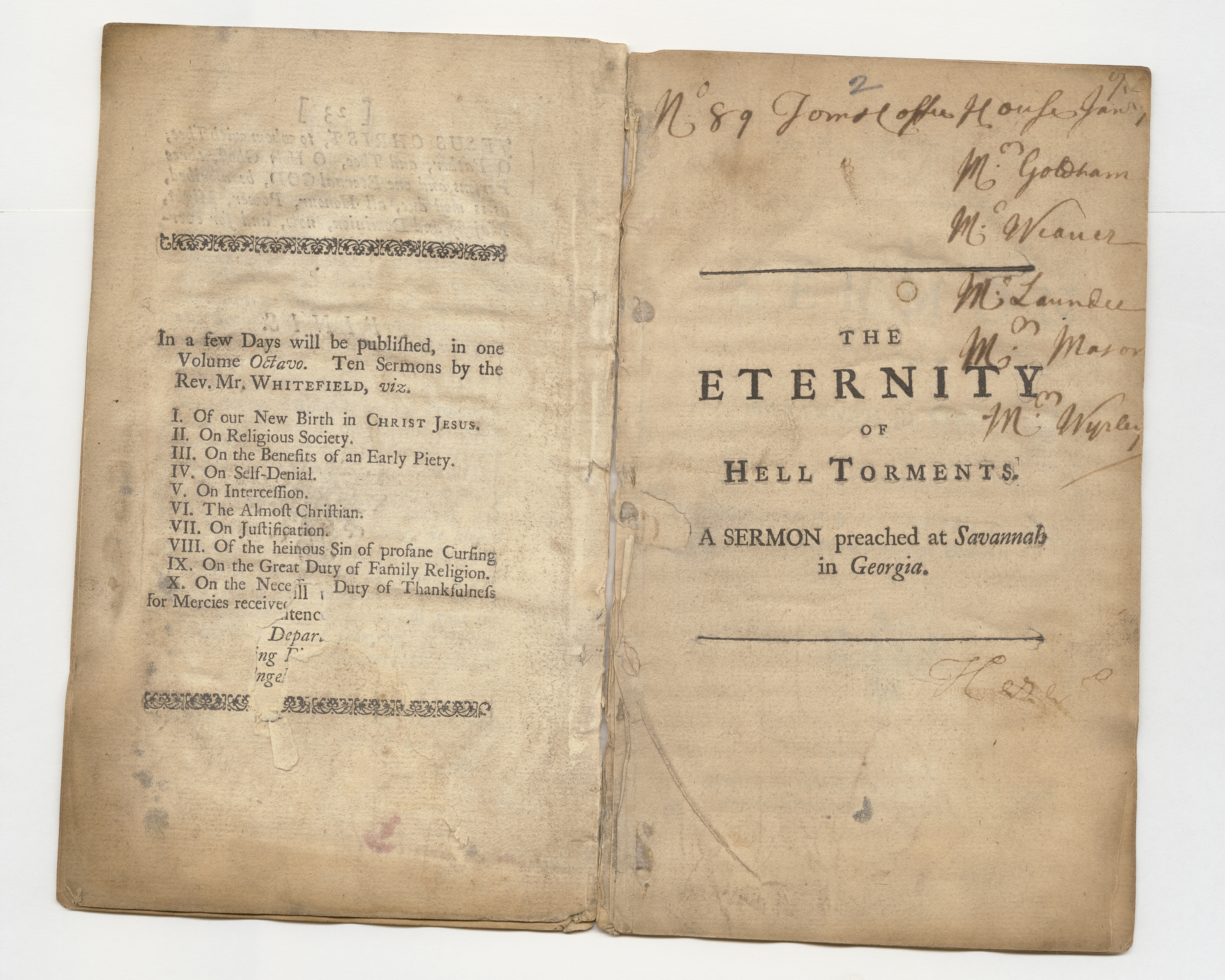 Summary:Signatures: [A]⁴ B-D⁴.Additional Details: Half-title, "The eternity of hell torments. A sermon preached at Savannah in Georgia." Half-title leaf bound in after title-page. "To the inhabitants of Savannah in Georgia." -- P. [iv]-viii. Signed: G. Whitefield. London, 1738. Publisher's advertisement, p. [1], at end.