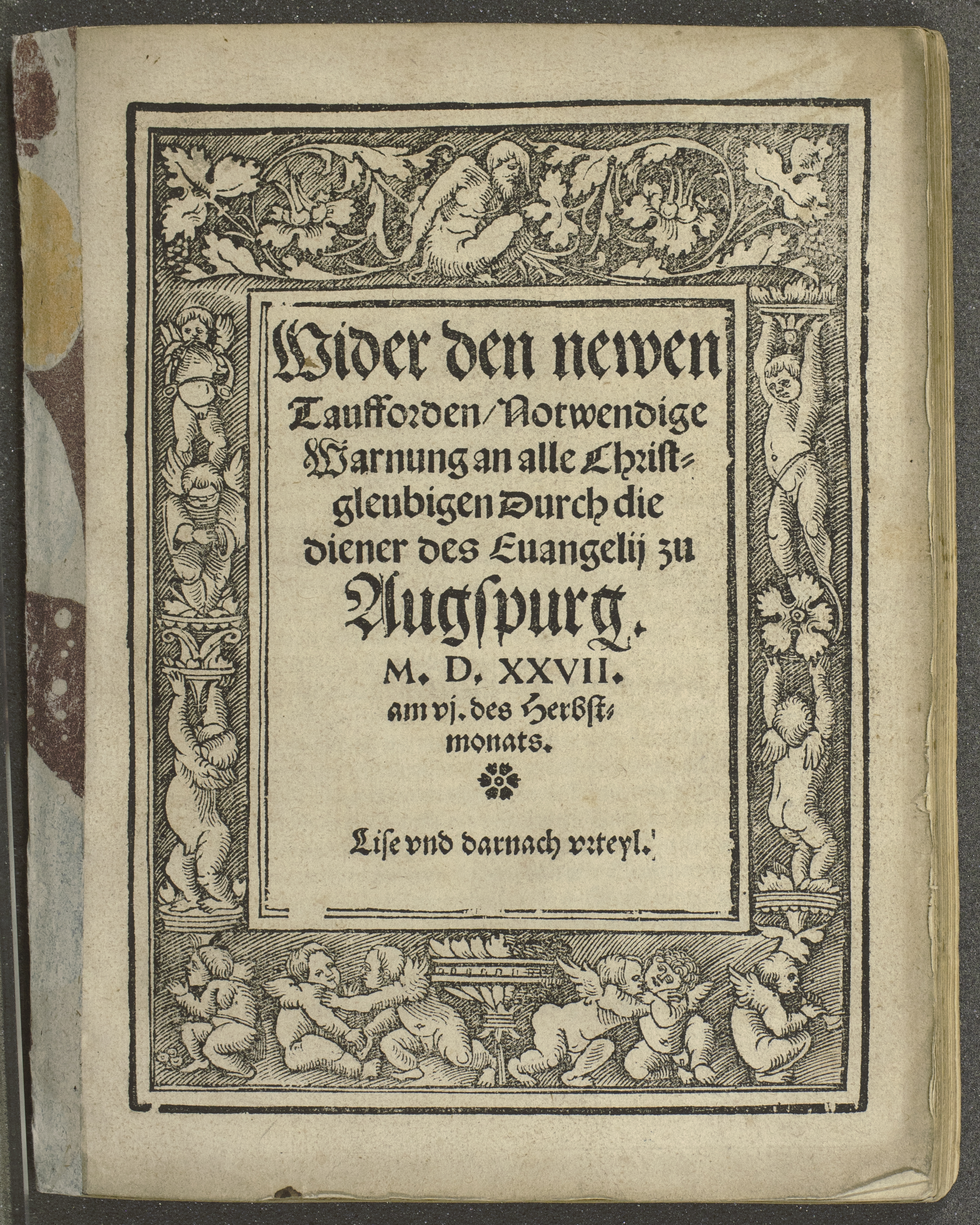 Summary: First and only edition of an important source about the early relations between the Lutheran and Anabaptist movements.Signatures: A-K⁴ L² M⁴.Imprint: Place and date from colophon, printer from VD 16.Illustrative and Decorative Content: Illustrated woodcut border on t.p.