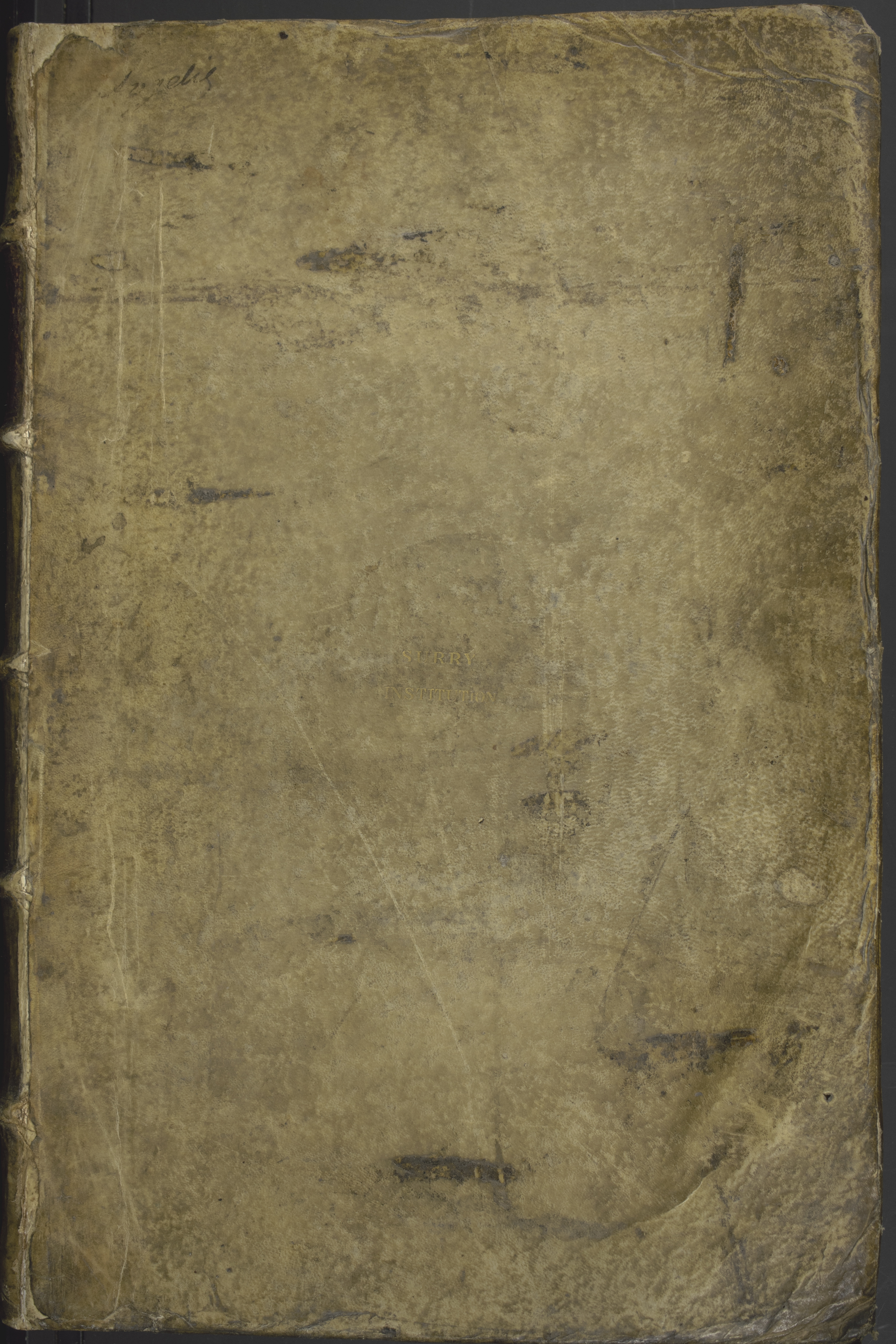 Binding: Bound in vellum with gilt stamp "Surrey Institution" on front cover, red morocco spine title label.
