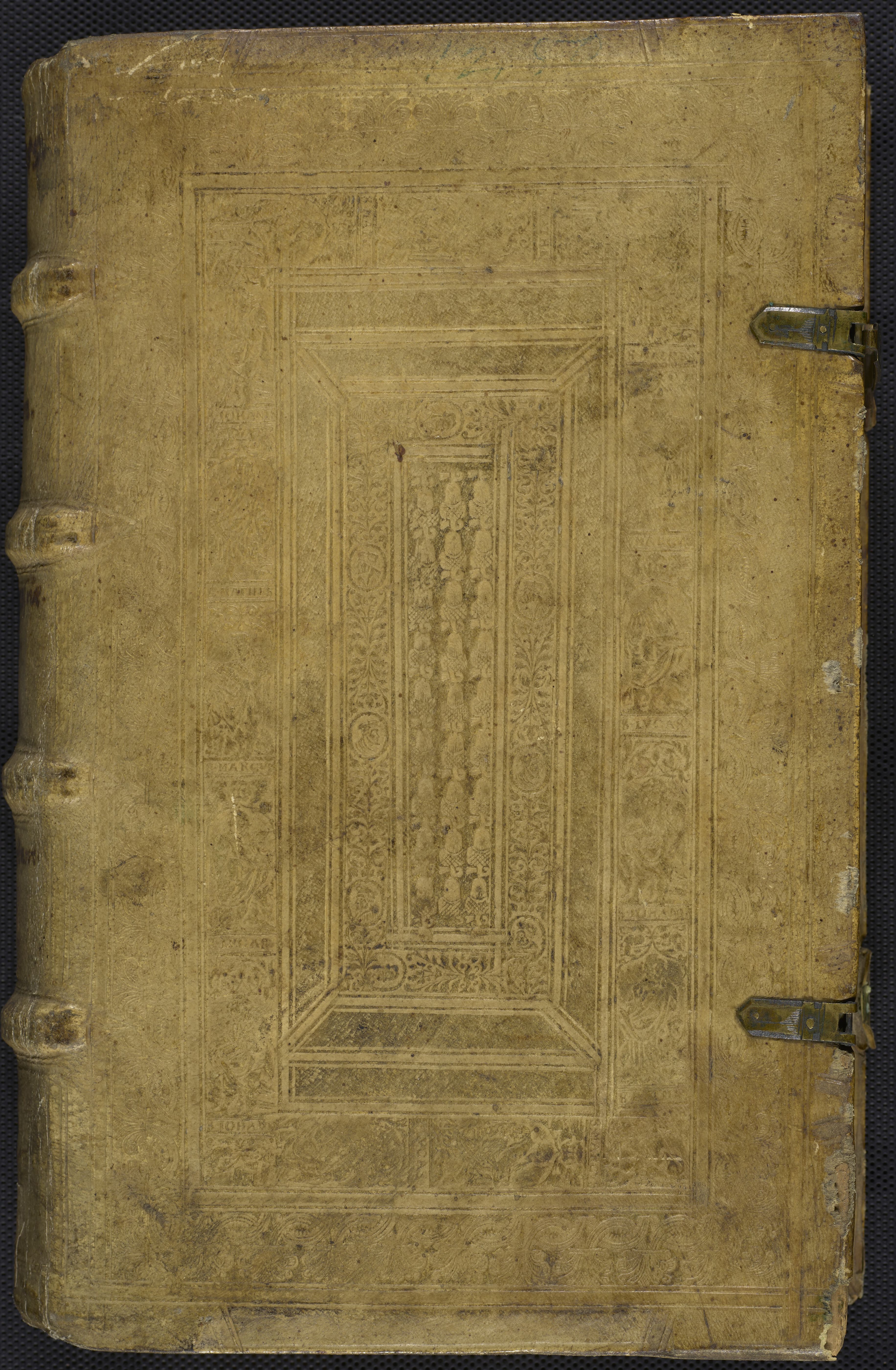 Summary: Commentary on the book of Exodus by Johannes Brenz.Signatures: a⁸ A-2E⁶ (2E6 blank)Illustrative and Decorative Content: Title in architectural woodcut border, initials.Binding: Bound in blind-tooled panelled alum-tawed pigskin over wooden boards.Additional Details: Includes index.
