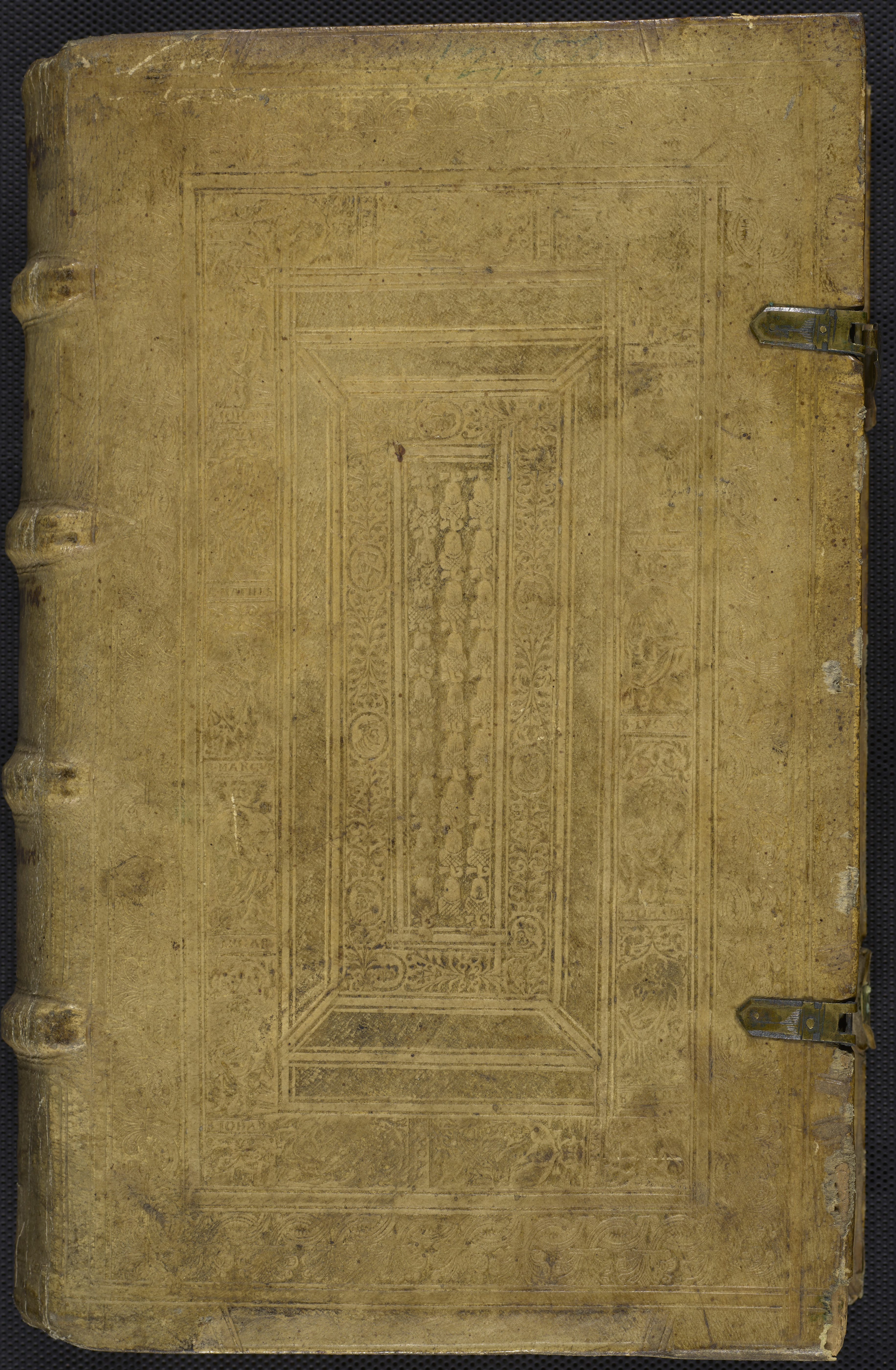 Summary: Johannes Brenz's commentaries on the books of Judges and Ruth.Signatures: &⁶ A-M⁶ N⁴ (N4 blank).Illustrative and Decorative Content: Title in architectural woodcut border, initials.Binding: Bound in blind-tooled panelled alum-tawed pigskin over wooden boards.Additional Details: Includes index.