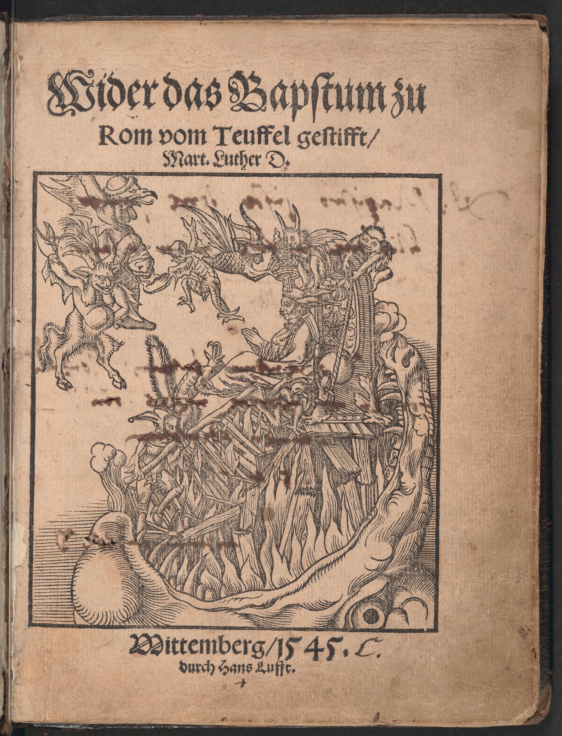 Summary: Luther's last great reckoning with the pope, issued in the year before his death, is a particularly biting satire. In the tract, Luther attacks both Divine and ecclesiastical legitimacy for the papacy.Signatures: A-2C⁴, last page blank.Illustrative and decorative content: Satirical wood-engraving from the workshop of Lucas Cranach, depicting the pope, with ears of an ass, sitting on a wooden throne at the mouth of hell, on the title page. On the flyleaf verso facing the title page is a sketch of Martin Luther, based on a 1546 woodcut portrait of Luther by Lucas Cranach. On the verso of the second blank page at the end of the book is a sketch of Pope Sixtus V (pope 1585-1590) below a polemical inscription. Initials.Binding: Bound in blind stamped contemporary pigskin with a front panel depicting Elector John Frederick of Saxony and a back panel depicting John Frederick's coat of arms. Above the front panel is the blind tooled inscription: D.M. LVTHERVS I. Ionae I. D[onum] D[edit].Additional details: Inscribed on title page verso by Martin Luther "D[onum] d[edit]: Magistro Justo Jonae Juniori filio meo in fide Christi Chariss[imo]: . . .Ad odiendum papam, Monstrum Horrendum, Informe, ingens ‘cui Lumen ademptum.’ 1545 Martinus LutheR D[octor]." A second inscription by Luther on the front inside cover reads “Apoc 18. Gehet von yhr aus, mein Volck, das yhr nicht teilhafftig werdet yhrer sunden. Auff das yhr nicht empfahet ettwas von yhrer plagen Denn yhre sünde reichen bis ynn denhimel vnd der HERR denckt an yhren freuel. 1545 Mart[in] LutheR d[octor].” Formerly owned by Justus Jonas, 1525-1567. On permanent loan from New Hanover Evangelical Lutheran Church in Gilbertsville, Pennsylvania.