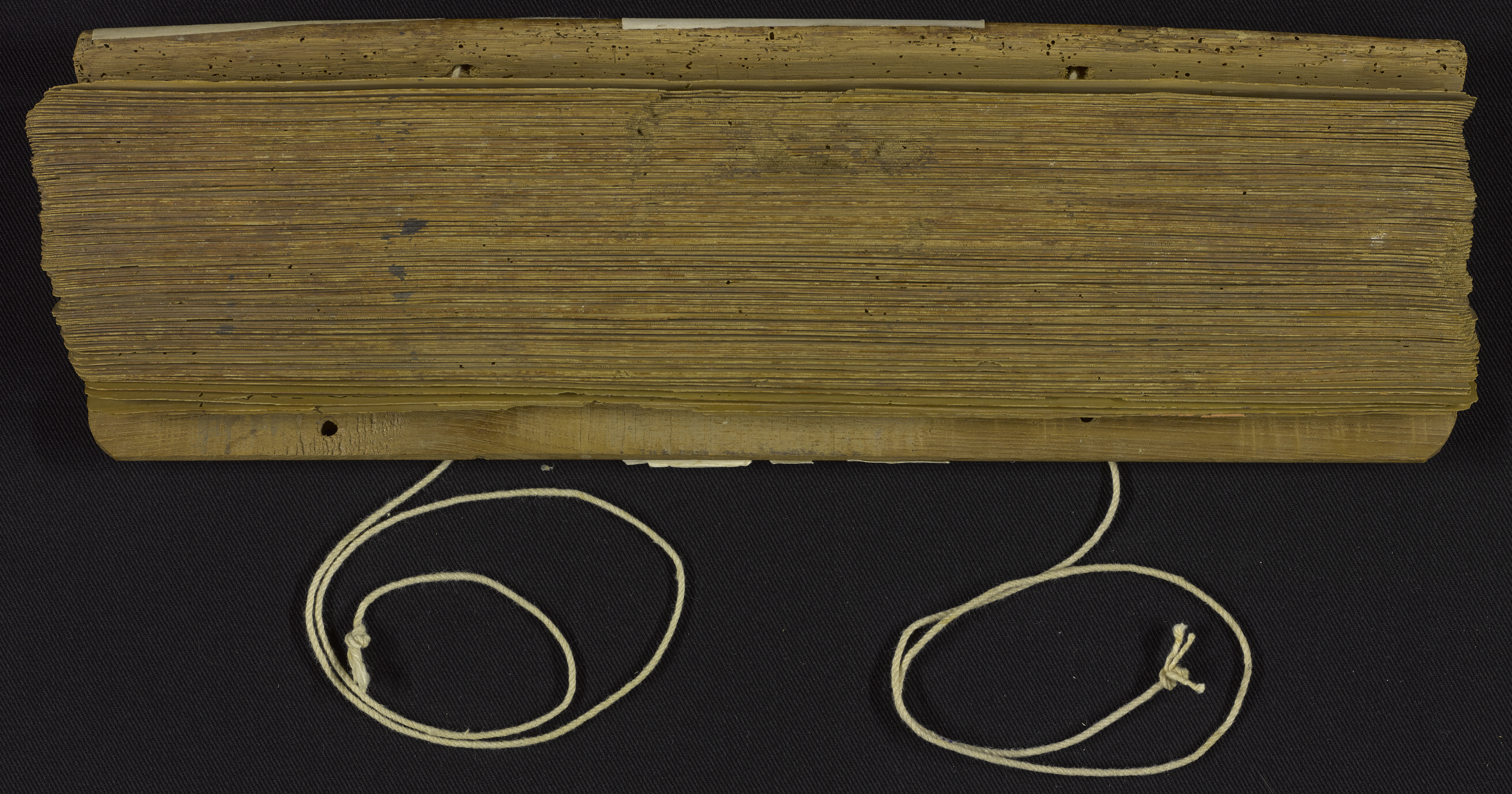This work was written on a palm-leaf manuscript (dried palm leaves were used as a medium for writing in South Asia). There is a total of 143 palm leaves in the manuscript. Each leaf is roughly 35mm x 430mm and is inscribed on both sides. There are also two holes in each leaf and the leaves are bound together with a cord running through the two holes and the whole manuscript is encased with wooden ends. Rounded scripts (such as Telugu) were used on palm-leaf manuscripts because angular letters split the leaves.This manuscript contains the Udyōga parva (The book of Effort), the fifth parva of the Mahābhārata. The Udyōga parva covers the efforts to engender peace among the warring brothers: the Kauravas and the Pandavas.