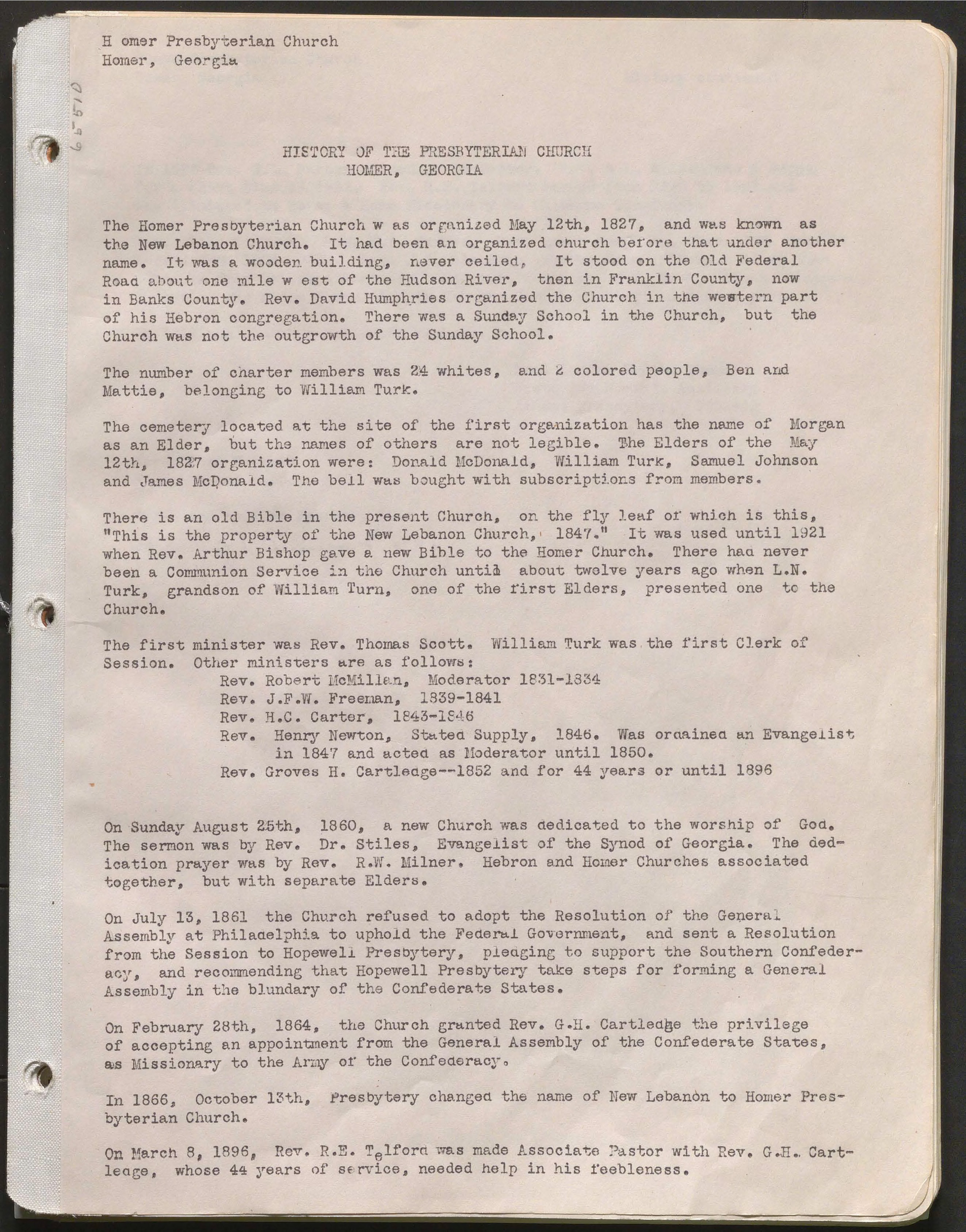 This history includes the years 1935, 1952-1954, 1956-1960. This history also consists of a list of charter members which include lists of white and "colored" members, other lists of membership and baptisms (1827-1860), church rolls, and a summary of the years 1827-1935 (part of the 1935 history). Other items include a history and the rules for government of the New Lebanon Sunday School, photographs of deacons William Harvey Turk, Joseph Columbus Turk, and Josiah Harvey Turk, and a biography of Colonel William Turk and other members of the Turk family.