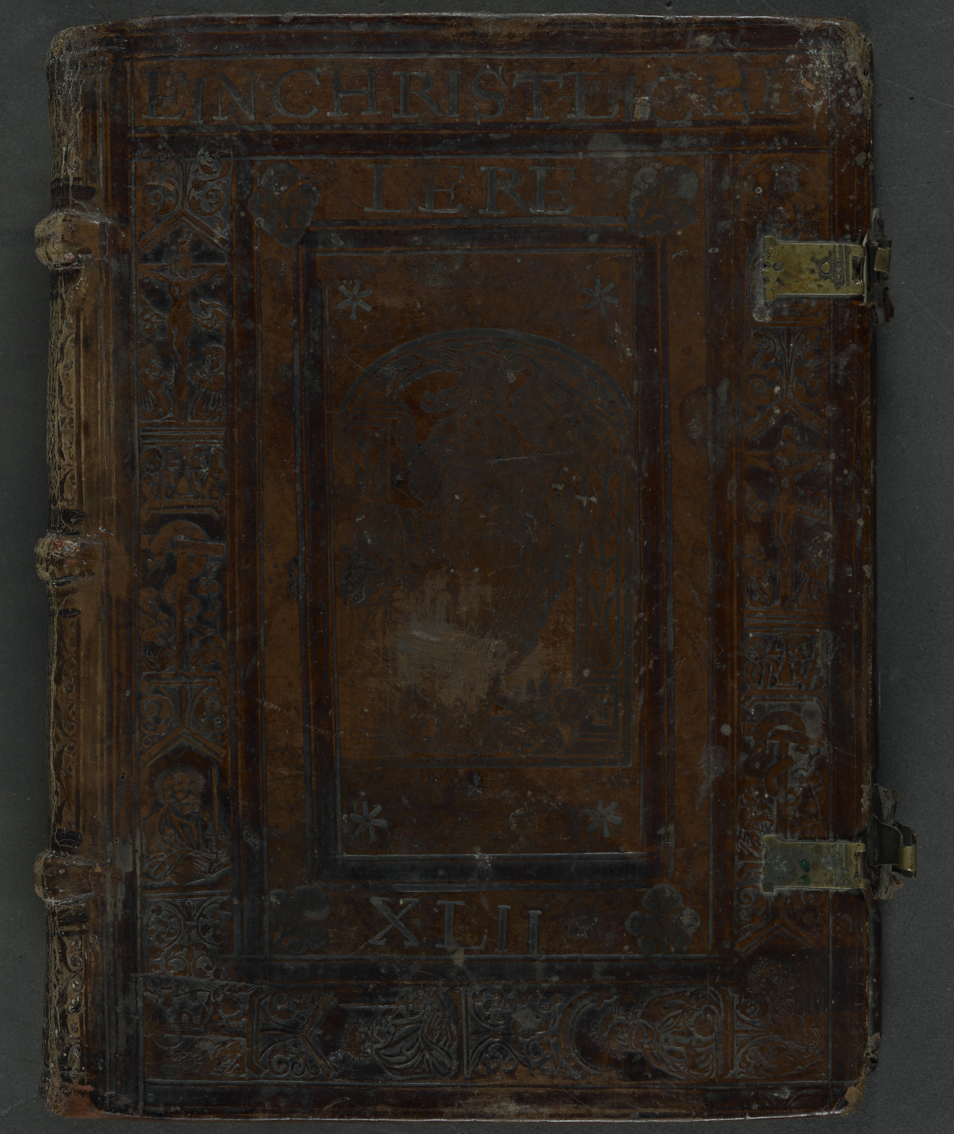 Summary: A Catholic catechism text.Signatures: A-Z⁴ a-c⁴.Illustrative and Decorative Content: Includes wood-engraved printer's mark on last p. Includes coats of arms on leaf A1 verso.Binding: Bound in panel-stamped, blind-tooled dark brown calf over wooden boards, with brass clasps.Additional Details: (Caption title) Ein gemeine Christliche lere in Artickeln so einem yden Christen zu wissen von nöten. Includes early ms. notes, one dated 1732.