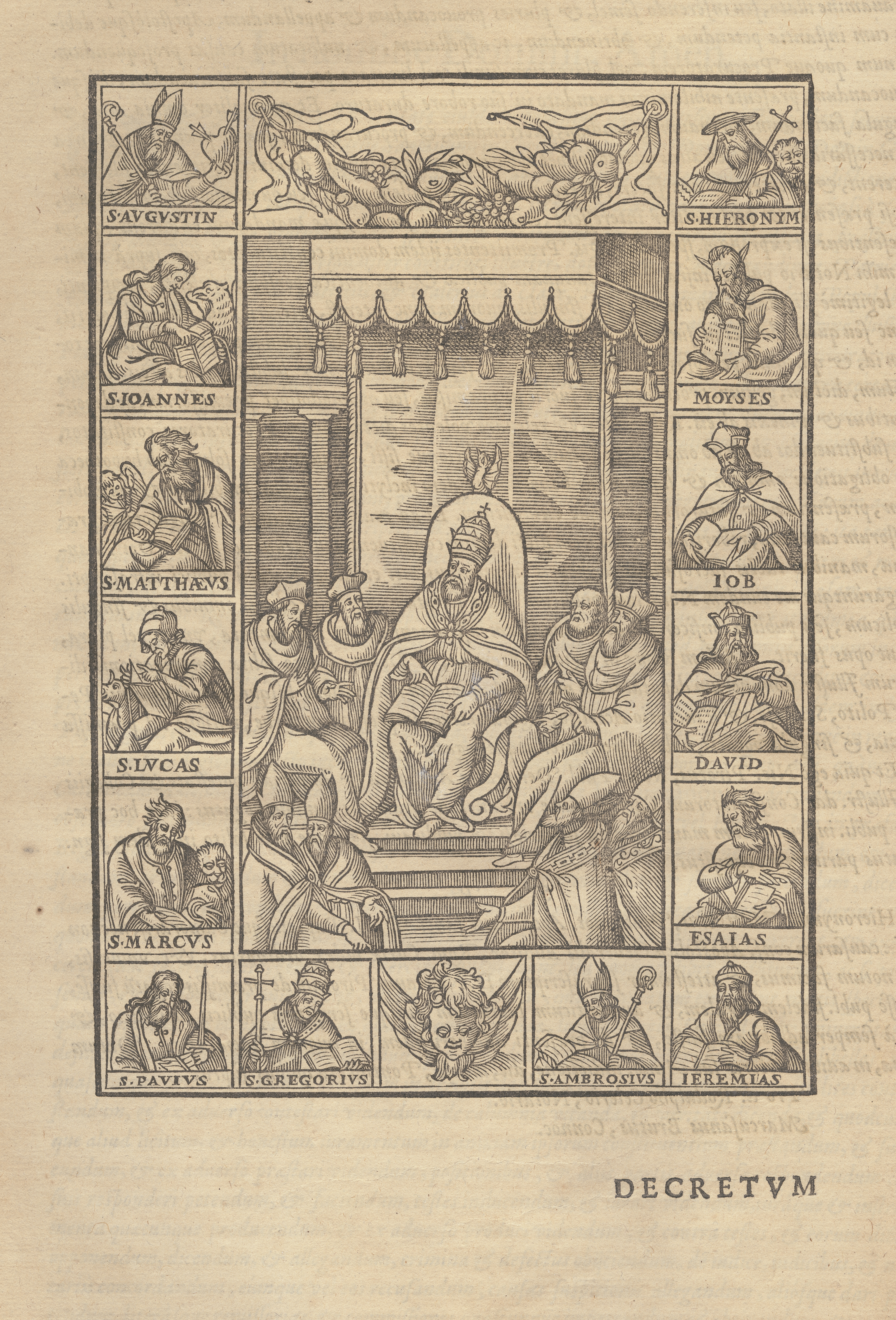 An engraving depicting a scene of the pope (possibly Pope Gregory XIII) enthroned and surrounded by bishops and cardinals, a dove perched on the back of his throne. Surrounding this scene is a series of portraits of saints and biblical figures, including (from top left down, around, and up): Saint Augustine, Saint John, Saint Matthew, Saint Luke, Saint Mark, Saint Paul, Pope Gregory I (Saint), Saint Ambrose, Jeremiah, Isaiah, David, Job, Moses, and Saint Jerome.