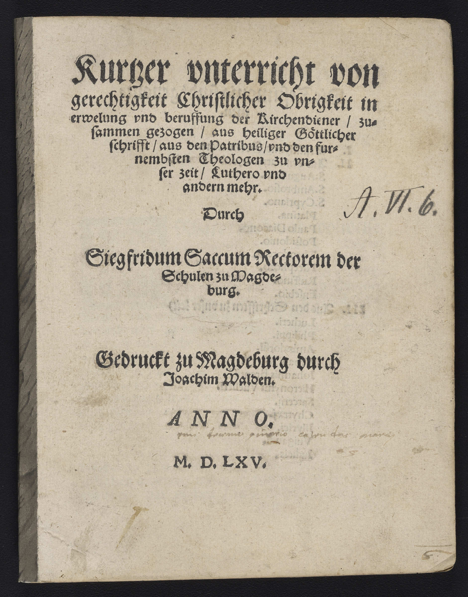 Summary: Formal opinion of Siegfried Saccus, schoolmaster at Magdeburg and later its first Lutheran cathedral preacher, concerning the right of the city government to appoint clergy. As a follower of the strict Lutheran Nicholas von Amsdorff, he steered a careful path between the views of the local Catholic hierarchy on the one hand, and those of the Münster Anabaptists, on the other. Although Magdeburg became a refuge of the strict Lutheran party following the Schmalkald War, the city council was late in making an official decision for or against the Reformation.Signatures: A-K⁴. Last p. blank.Illustrative and Decorative Content: Historiated initial.
