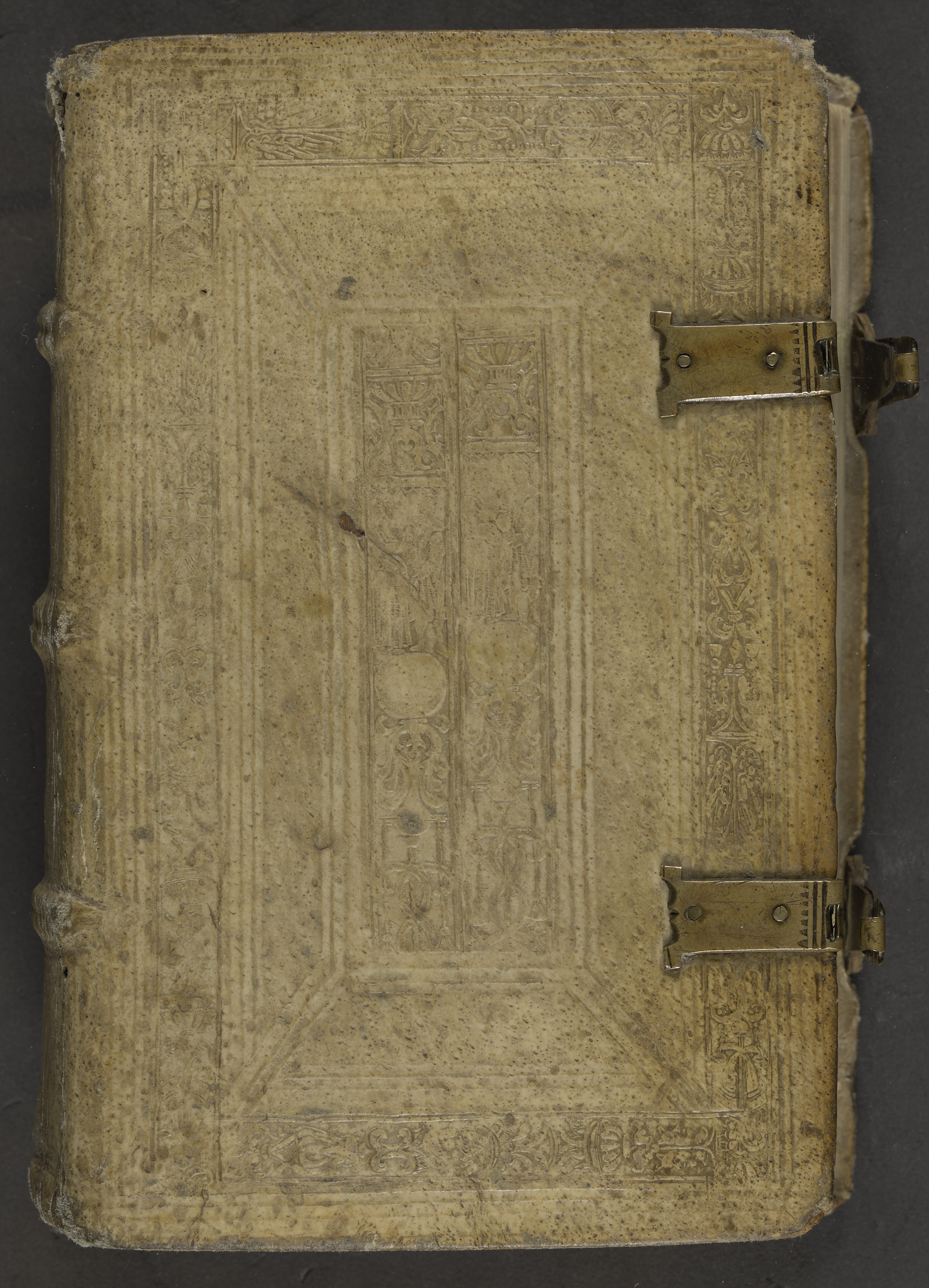 Summary: Eight-line note on rhetorical terms in 16th century Latin mss. on inside front cover; book plate and stamp of former owner Camille Aboussouan on inside front cover and verso of front flyleaf respectively; three Latin distichs identifying former owner as "Joannes Kenerus"; "Freht dich und gnad dir Gott": in ms. surrounds prrinter's device on title page; first few leaves with contemporary manuscript marginalia; "Statua Martis" in 16th century Latin mss. surrounds printer's device on last verso.Signatures: a-z8, &8; [a] unsigned, a1b, z6b, &8a blank, e3, g5, s4 unsigned, p5 missigned "n5."Illustrative and Decorative Content: Printer's device on title page and on p. &8b (statue of Mars); initials throughout.Binding: Bound in blind-stamped bleached pigskin over boards, clasps intact.Additional Details: Includes index. In VD16 under: "Untergeschobene Werke"