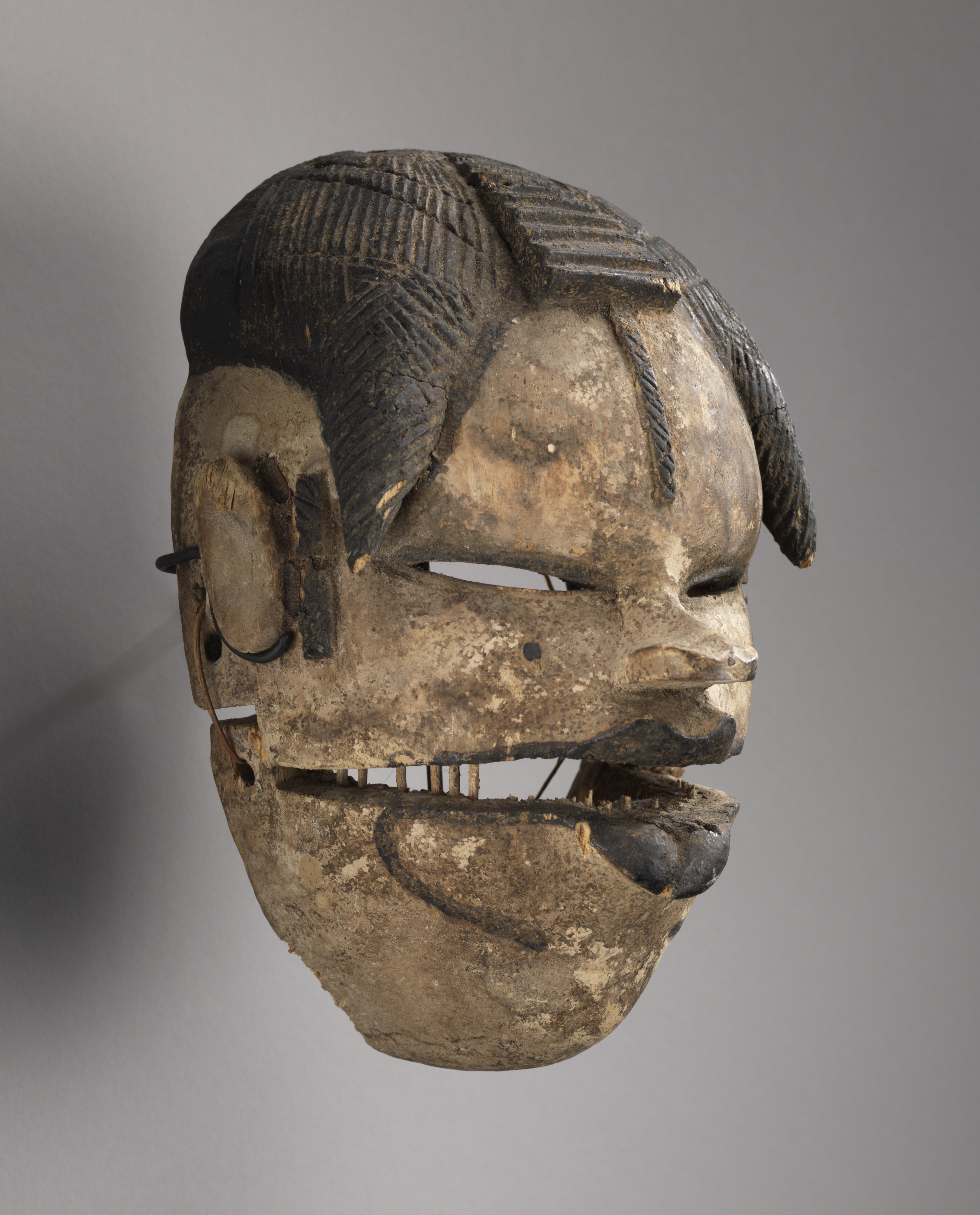 Small delicately carved face masks with pert noses and childlike facial features representing male and female spirits (elu) appear in village masquerades among Ogoni peoples living between the Niger Delta and Cross Rivers of southern Nigeria. Many of these face masks are cut across the mouth allowing the wearer to articulate the jaw as the spirit speaks through him. The open mouth reveals narrow teeth, usually made of cane.Photograph by Bruce M. White, 2011