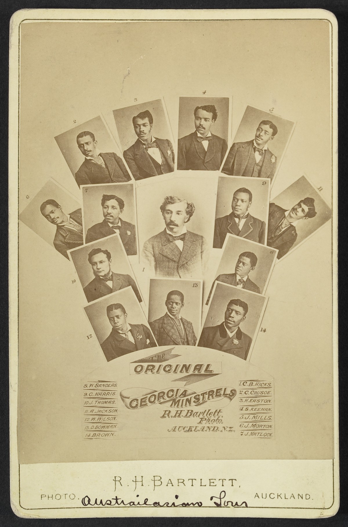 A collage of portraits of "The Original Georgia Minstrels". Each portrait is numbered and their names listed: 1) C. B. Hicks, 2) C. Crusoe, 3) H. Easton, 4) S. Keenan, 5) J. Mills, 6) J. Morton, 7) J. Matlock, 8) W. Sanders, 9) C. (G.) Harris, 10) J. Thomas, 11) A. Jackson, 12) W. Wilson, 13) D. Bowman, and 14) Brown.