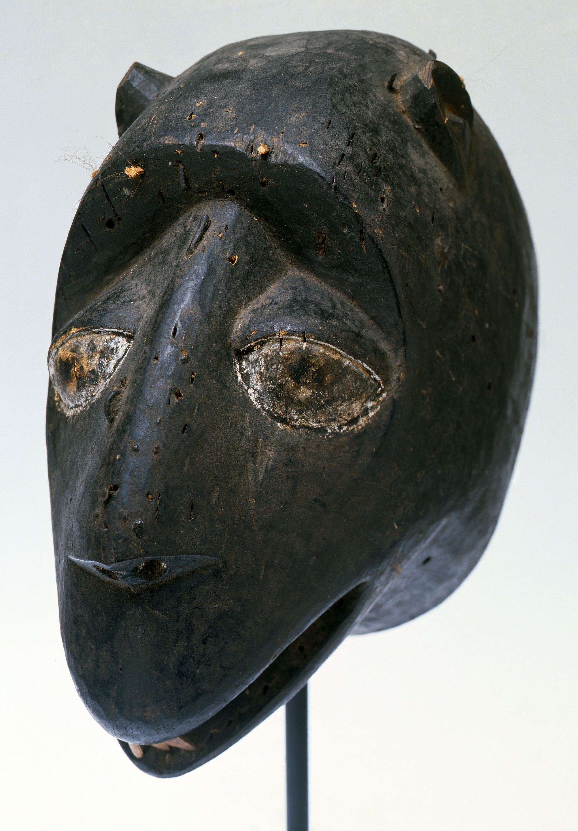 A headdress carved from wood and decorated with animal hair, bamboo, iron, and pigment.Photograph by Michael McKelvey.